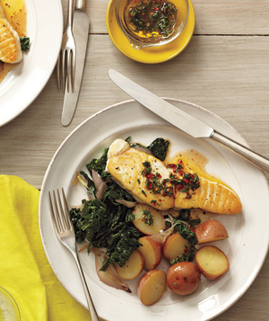 - Serve the halibut with the potatoes and kale. Drizzle with the lemon-thyme vinaigrette.
